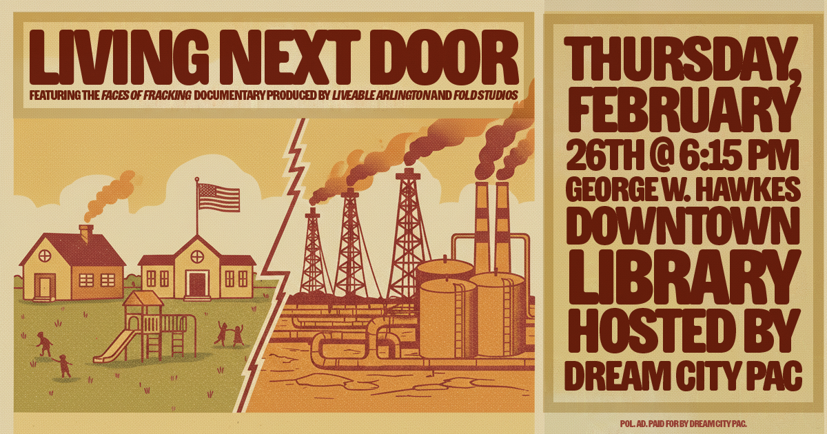 Living Next Door is an upcoming community workshop hosted by Dream City PAC, centered around the documentary Faces of Fracking, produced by Livable Arlington and Fold Studios. The film tells the stories of six Arlington residents who live, work, and raise families near active drilling sites, offering a deeply personal look at how fracking intersects with daily life in our city.